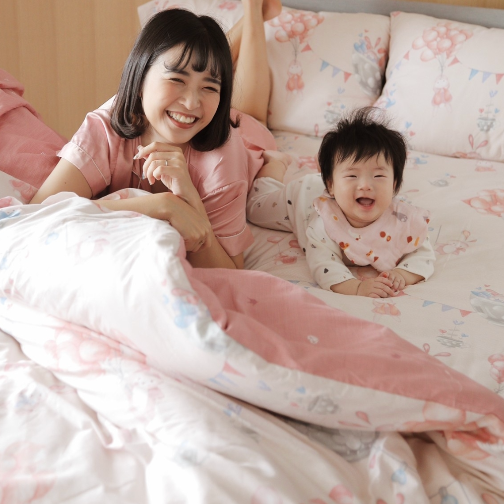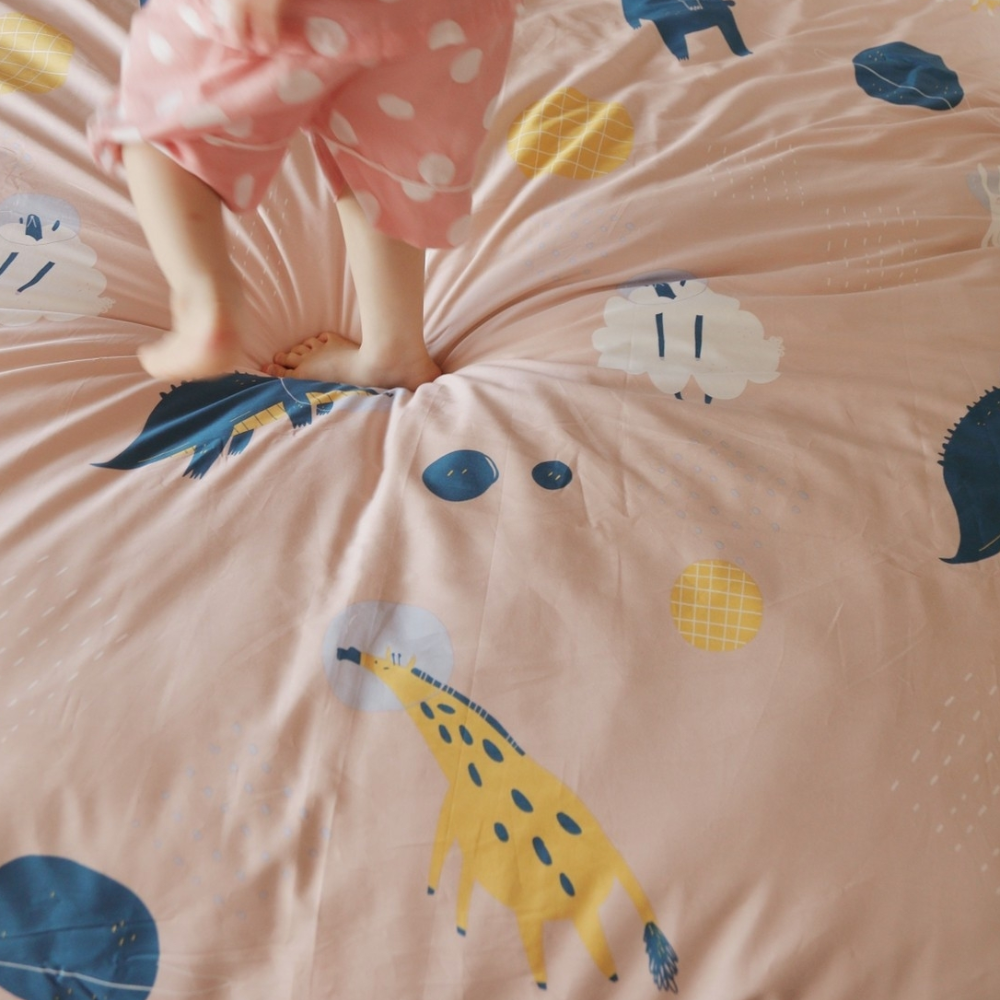 床組質感好、花色精緻、觸感也很棒,而且小奏央一看到就超興奮,一直拉著我說:「これクマ!これネコ!きりんよー!(這個熊!這個貓咪!還有長頸鹿喔)」然後就開始滾床了哈哈哈