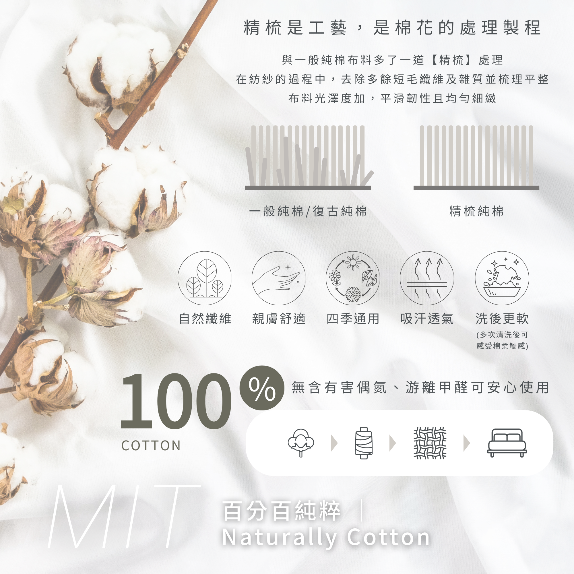 與一般純棉布料多了一道「精梳」處理,在紡紗的過程中,去除多於短纖維及雜質並梳理平整,布料光澤度佳、平滑韌性且均勻細緻