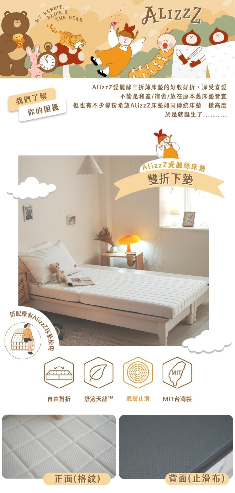 上層使與AlizzZ床墊一樣的天絲表布,下層採用止滑布料