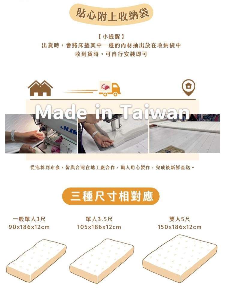 三不一沒有:【不】提供搬運上樓 / 【不】協助回收舊床墊 / 【不】開放貨到付款